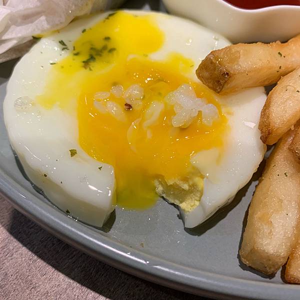 套餐的蛋是偏熟的太陽蛋,還附贈胡麻豆腐沙拉和薯條🍟